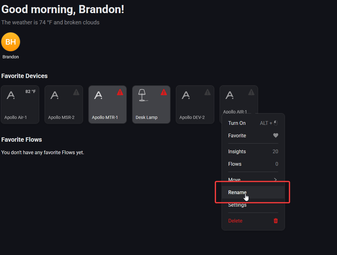 1. Open the Homey App or dashboard in a browser and right click a device or short hold and then select "Rename".