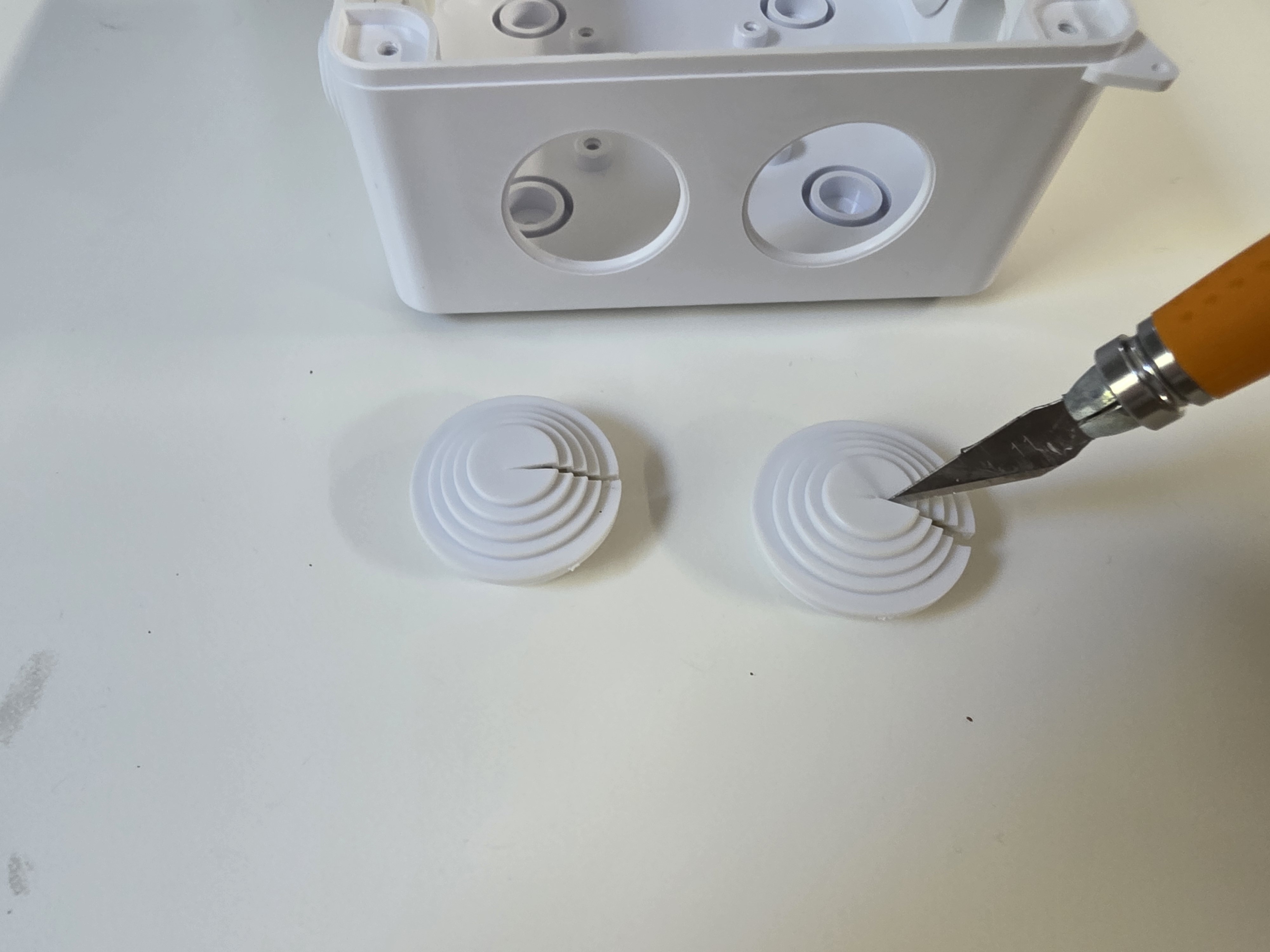 3. Remove two of the rubber grommets and cut a small slit using the hobby knife to allow for the power and data connections. The two bottom grommets might be best for an outdoor setup to prevent any water from getting in.