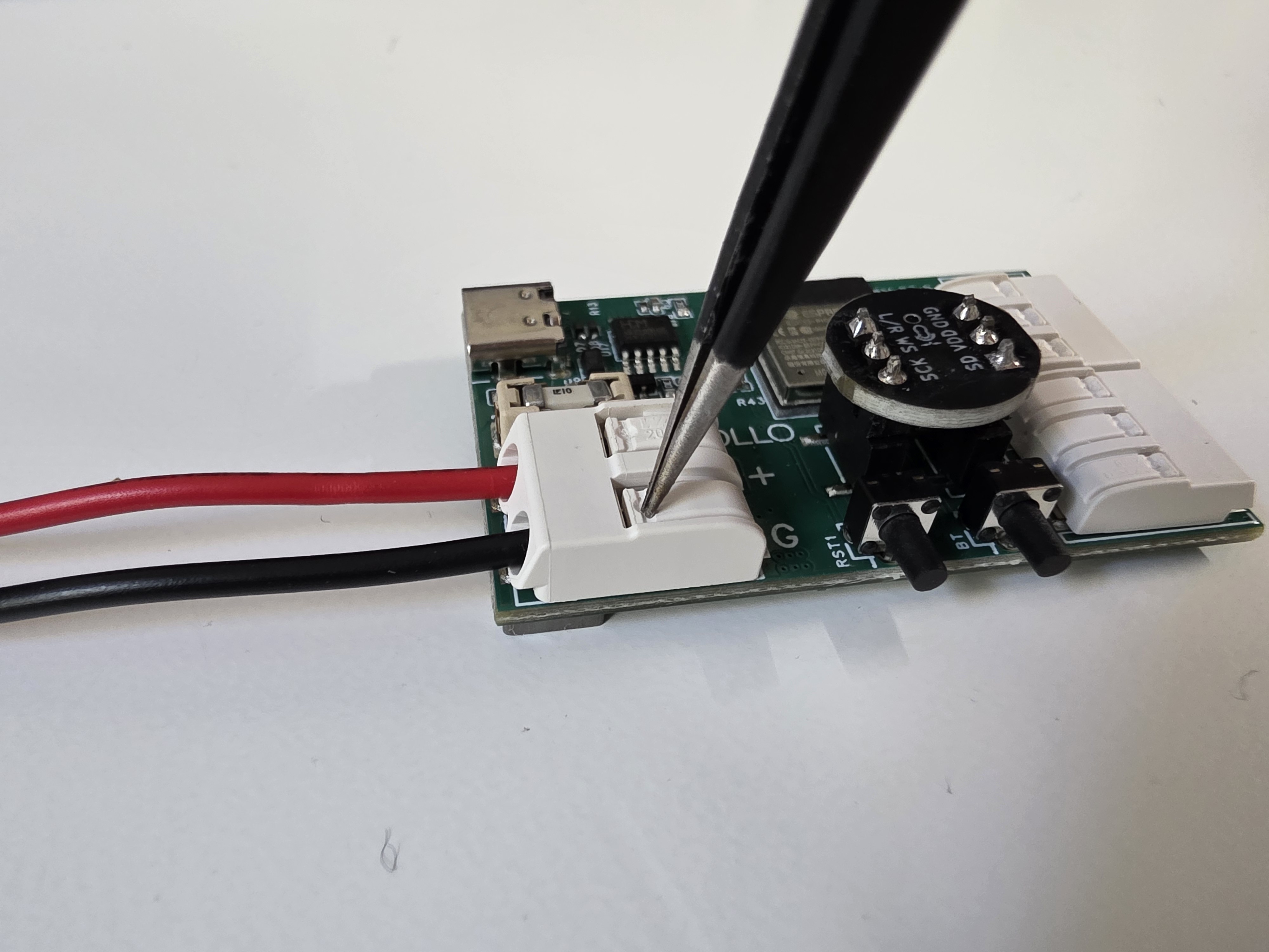 4. Connect the barrel plug to the WAGO connector. It is the large white compnent on the bottom left of the board below the USB-C port. Connect the RED (+) wire to the top terminal and the BLACK (-) wire to the bottom terminal. You can use the tweezers to depress the top of the WAGO connector, insert the wire, and then release to lock it in place.