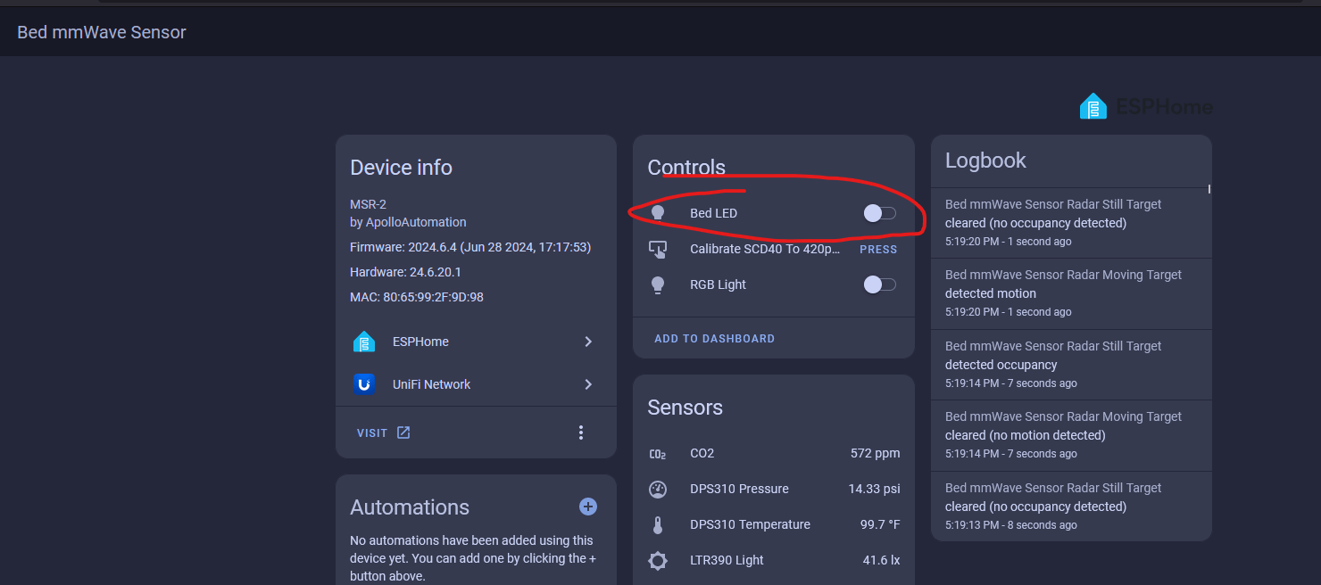 Finally, we need to tell the MSR-2 that we connected an LED strip. We need to tell it how many LEDs we have and we need to tell it that it's our second LED since the built-in LED is the first. This tutorial assumes you are comfortable with the ESPHome dashboard.