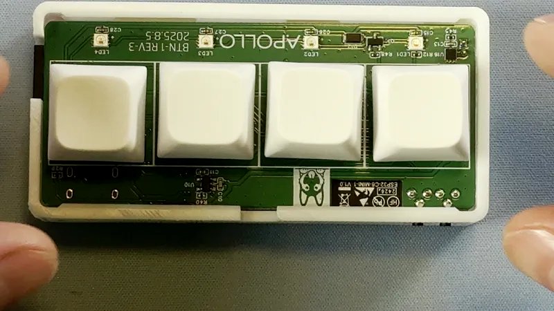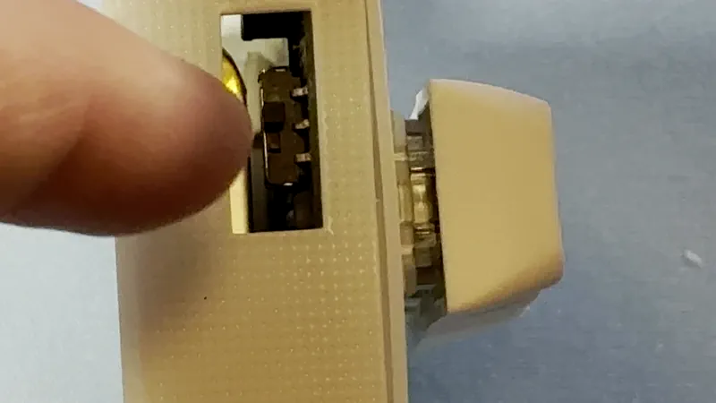 2. Gently place the BTN-1 green PCB back in the case at an angle so the buttons will slide into cutout in the case.