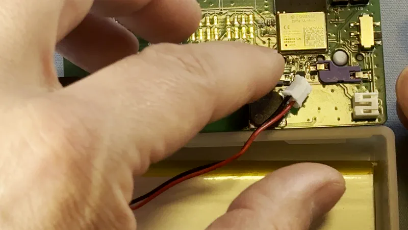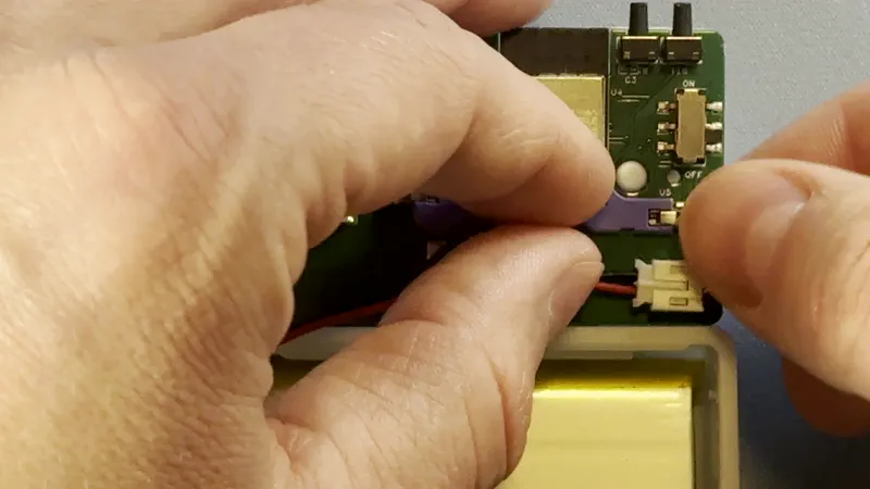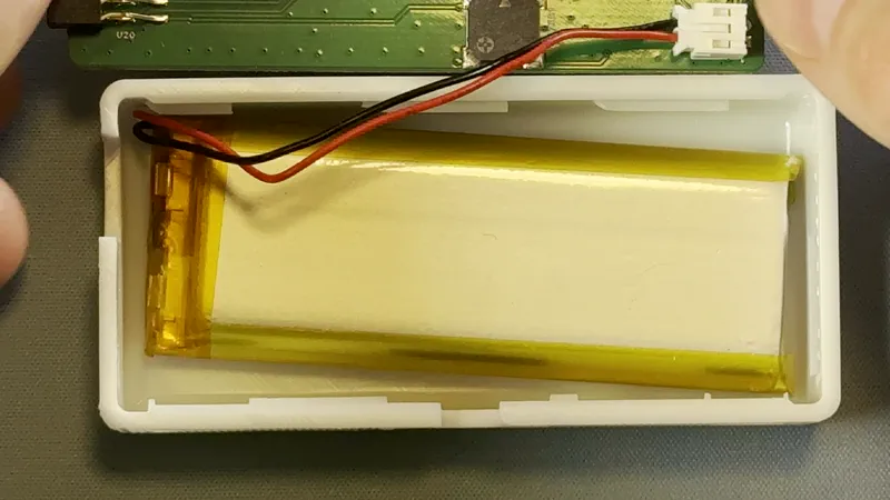 1. Re-attach the 2-pin JST connector and place the battery writing side down with the wires on the left side of the case.