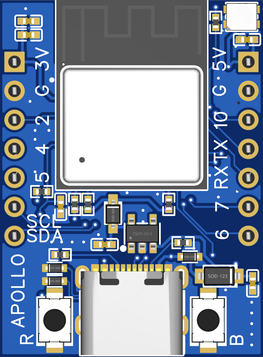 The Apollo DEV-1 is a very small dev board that we use to prototype before creating other new products. It has a built in RGB light (using GPIO3) and can push up to 600mA out of the 3.3v pin however 100-200mA of that will be used by the microcontroller itself. You are able to back-feed power via the 5v and G (ground) pins or use the USB-C port to power it, but NOT both at the same time.