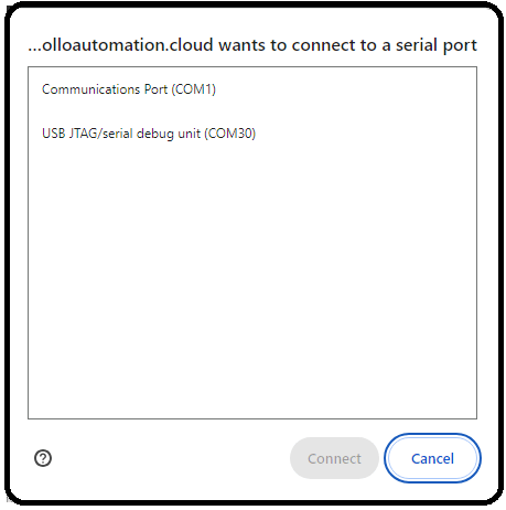 If no device shows, click cancel and then install the recommended driver that shows on the popup. If you have installed the driver, tried different cables, and it still won't work refer here for putting the MSR-1 in bootloader mode and then retry step 3. Putting MSR-1 In Boot Mode Document