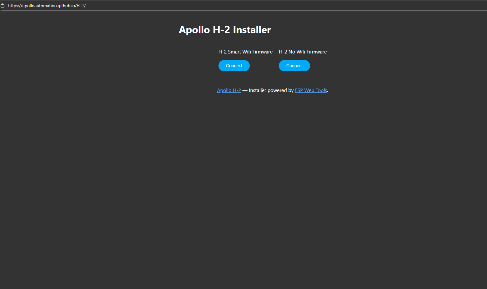 4. Navigate to our installer page using a chromium based browser such as Chrome or Edge and click connect under H-2 Smart Wi-Fi Firmware or H-2 No Wi-Fi Firmware. Select the open com port and click connect.