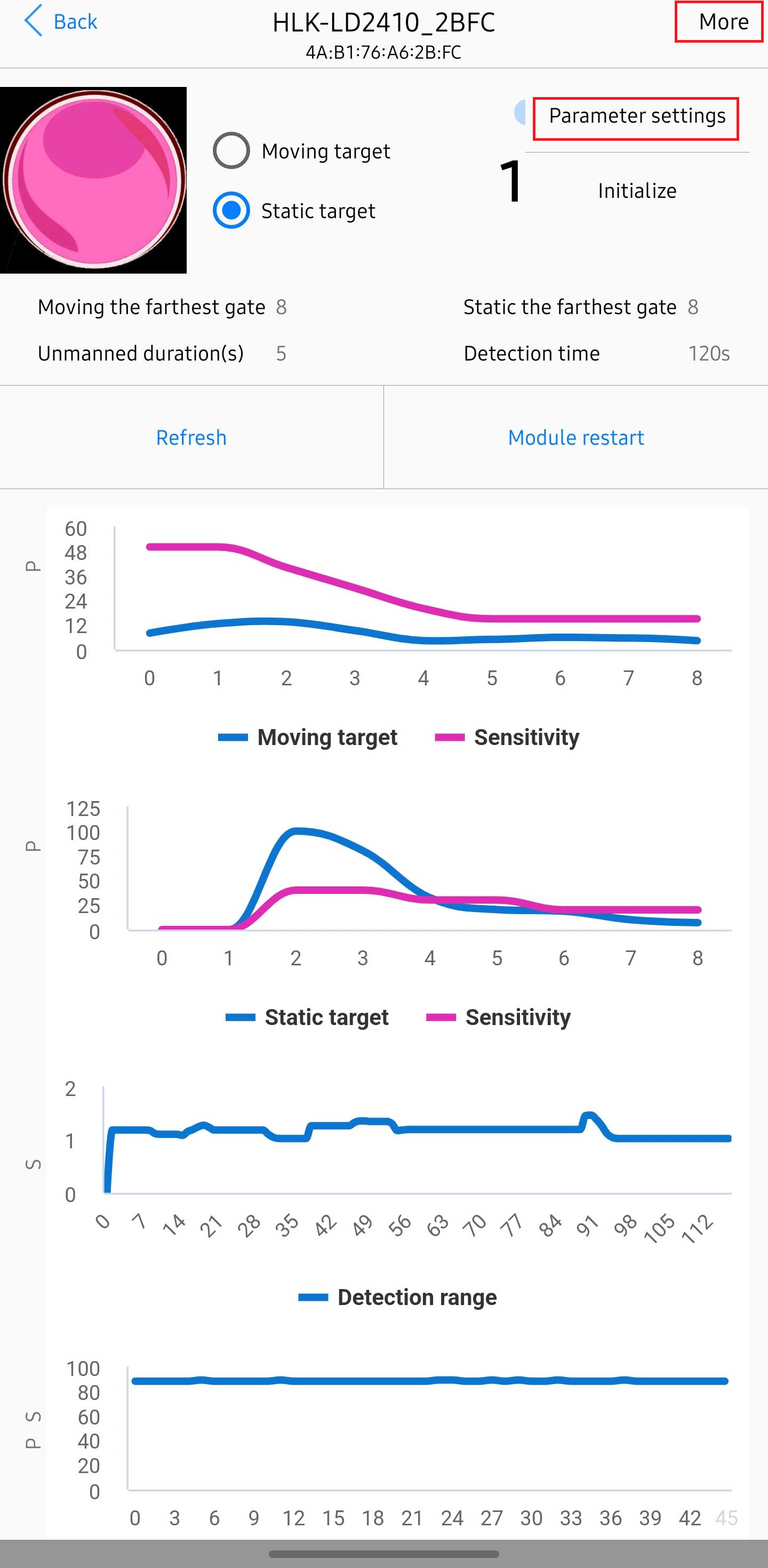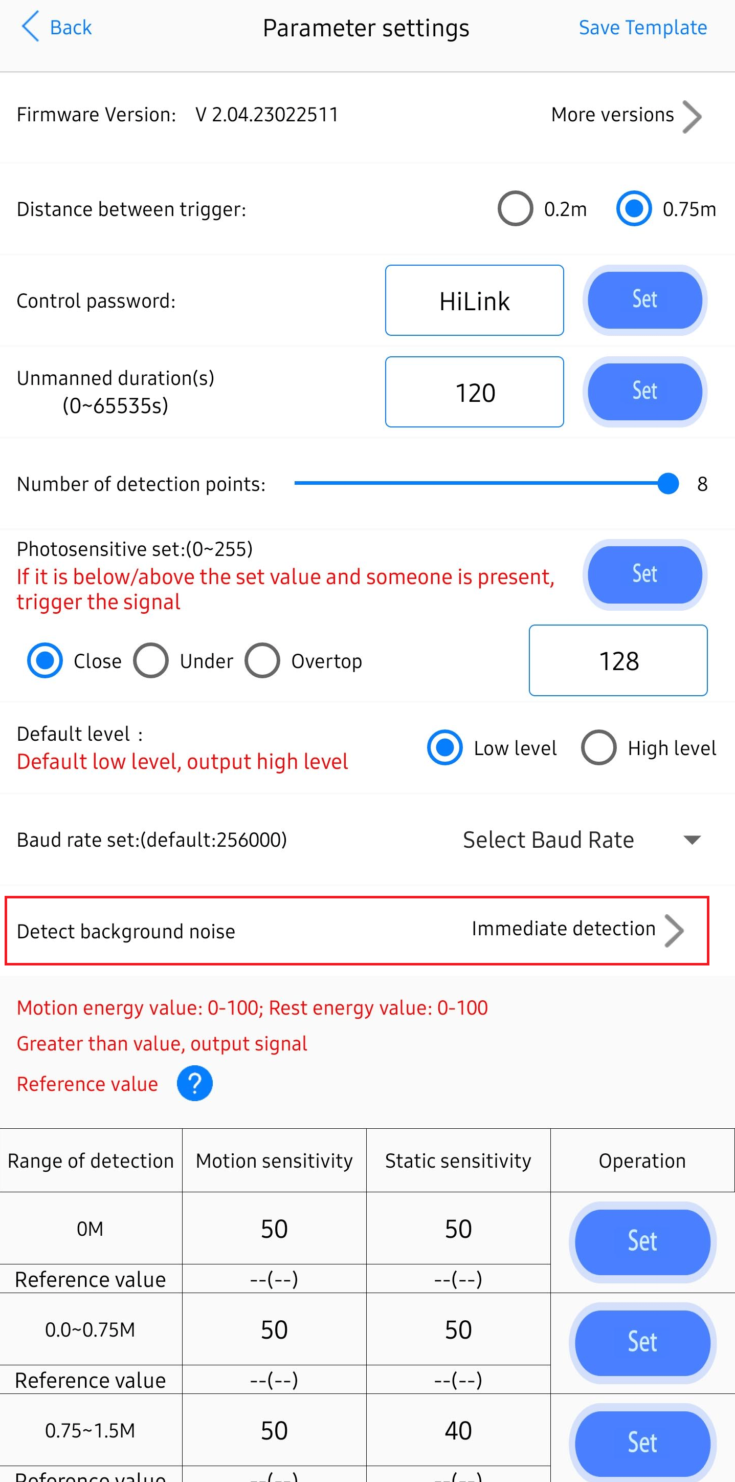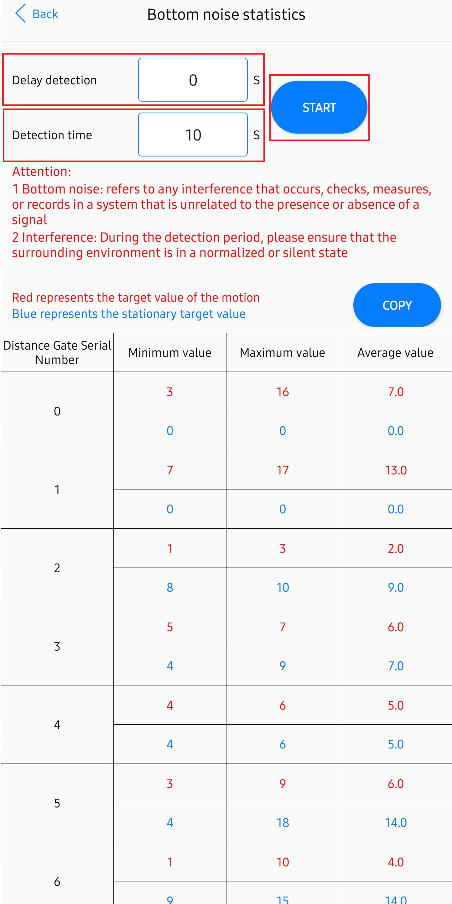 6. Insert Delay detection and Detection time values. (For iPhone users Delay detection cannot be 0). Then select Start. This will give us our reference values so we can auto-calibrate the mmWave sensor.