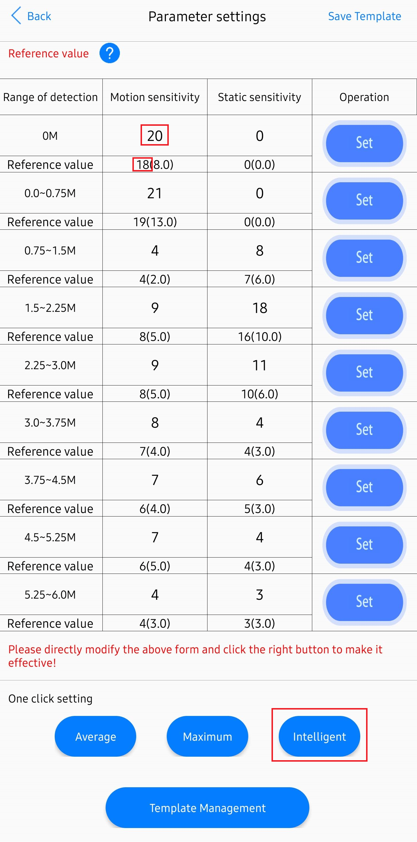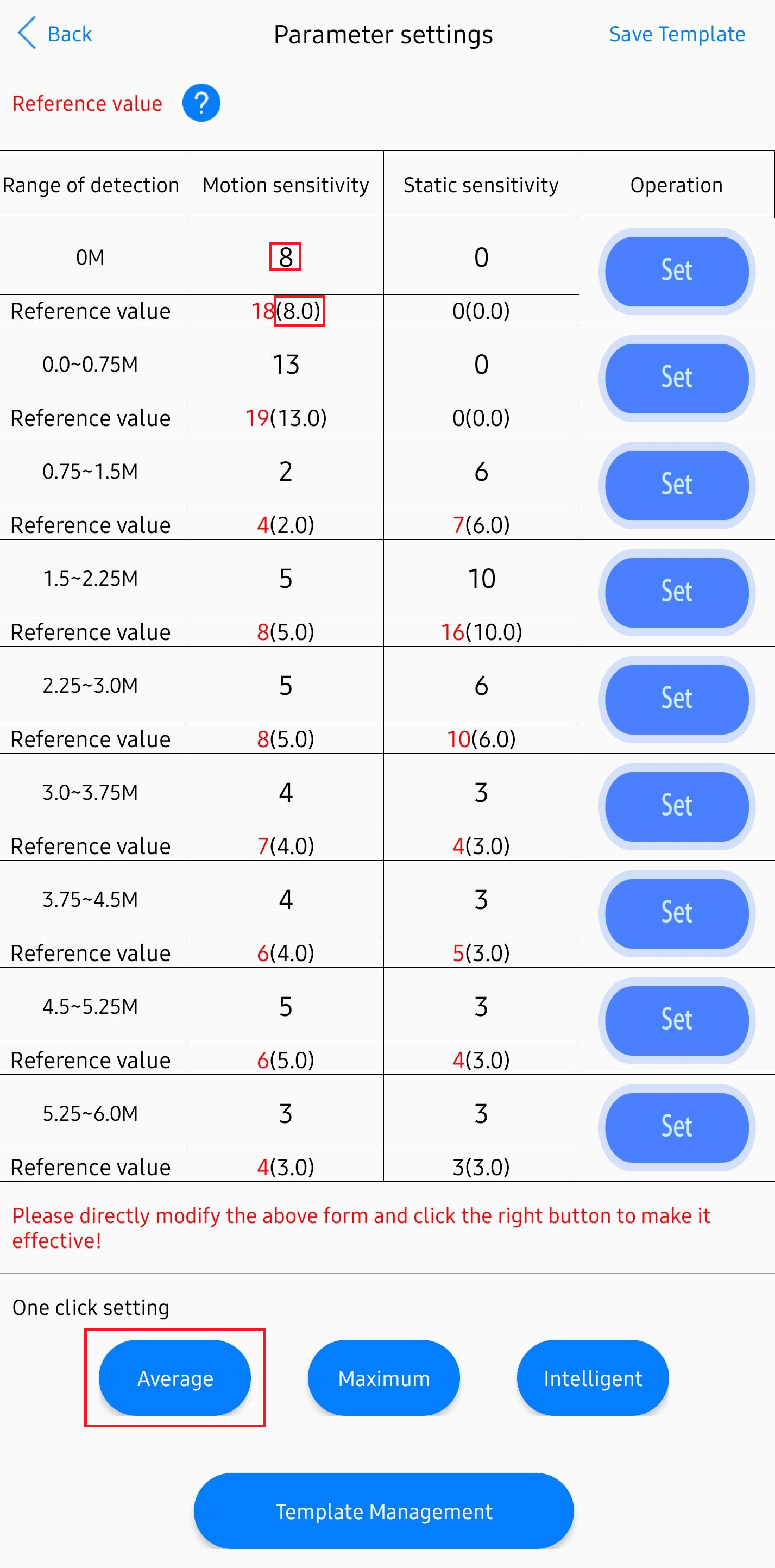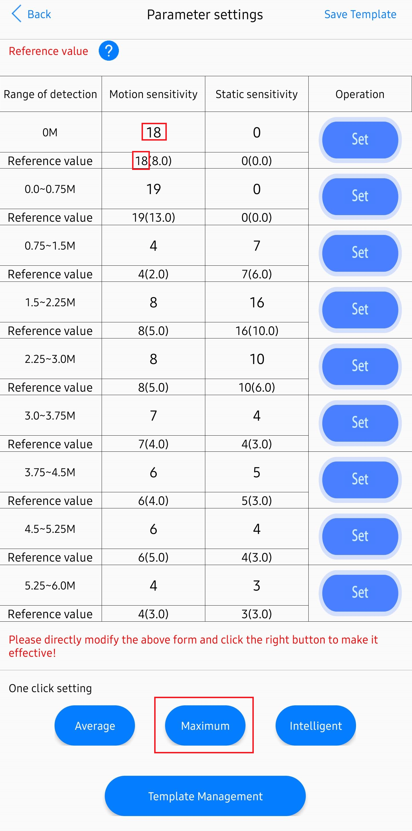 6. Insert Delay detection and Detection time values. (For iPhone users Delay detection cannot be 0). Then select Start. This will give us our reference values so we can auto-calibrate the mmWave sensor.