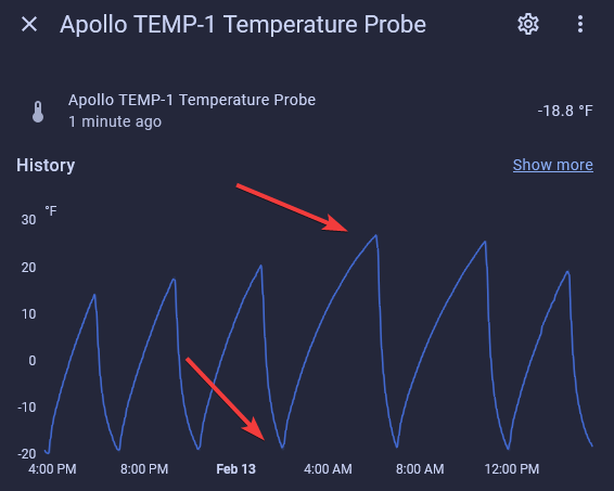 2. Once normalized, look at the graph and determine a good value to set for both the maximum and minimum temperatures. My mini freezer seems to max out at 30F so I would want to go slightly above that range. However, in most freezers they should NOT reach above 0F so you will likely need to input a lower value than me. my minimums are around -20F.