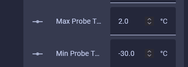 3. We now need to convert F to C since the max and min temps are measured in Celsius. My new values I will input are max probe temp 2C and a min probe temp of -30C. Reminder, yours will likely be different values, especially your max probe temp.