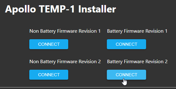 2. Navigate to our installer page and click connect under Battery Firmware Apollo TEMP-1 Installer